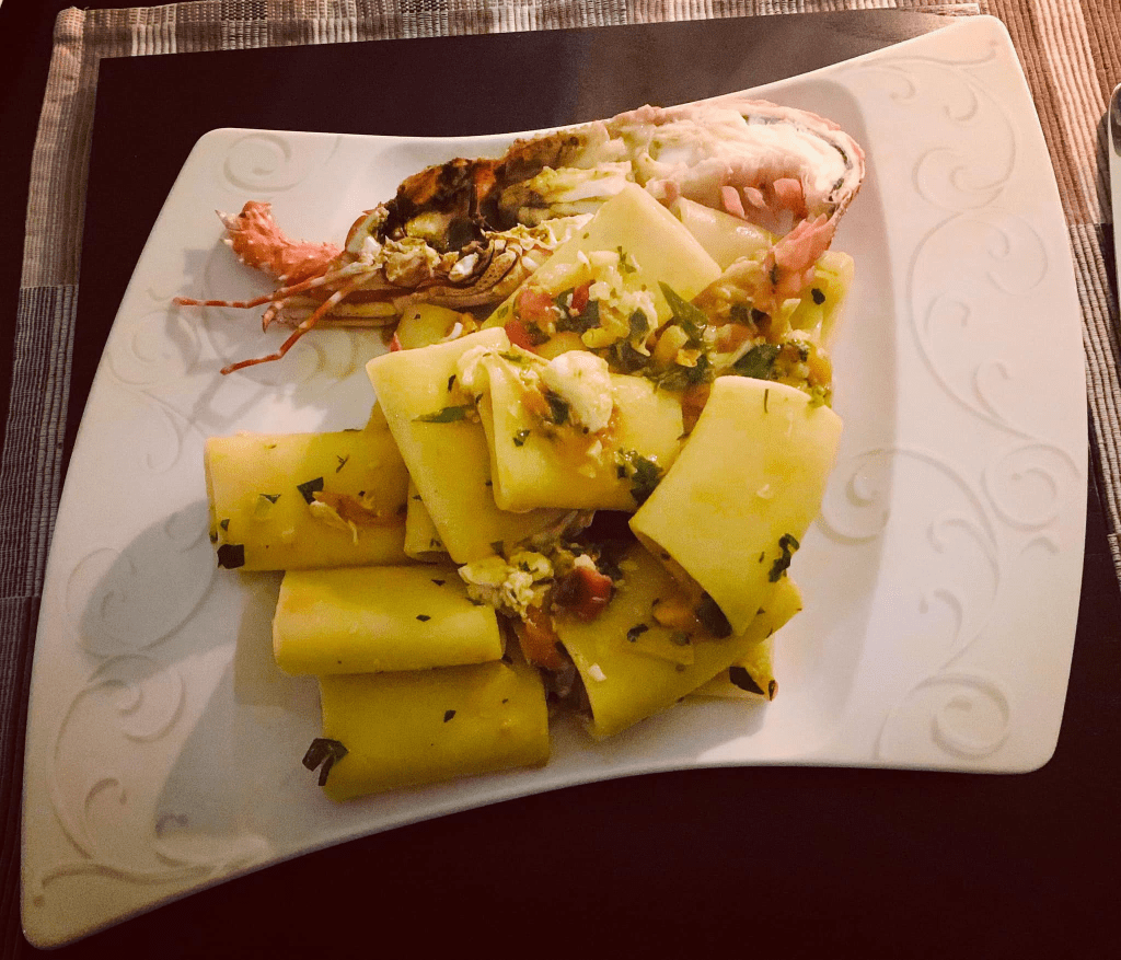 Paccheri shaped pasta with Lobster sauce, yellow sweet cherry tomatoes and lemon.
